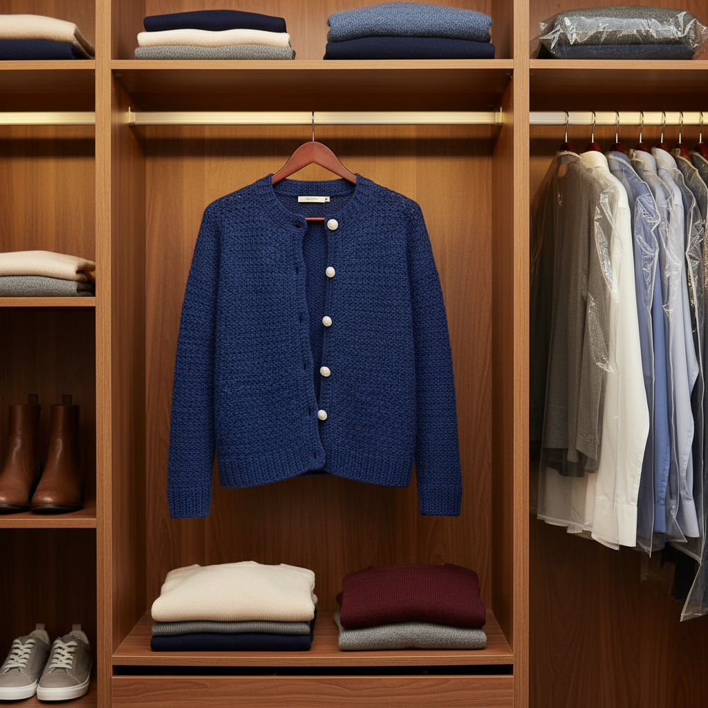 This clean crew-neck design features a beautifully textured stitch pattern that adds depth without feeling bulky. With a relaxed fit, ribbed edges, and a button-up front, the silhouette is flattering, practical, and easy to style — perfect over dresses, tees, or cozy layers.