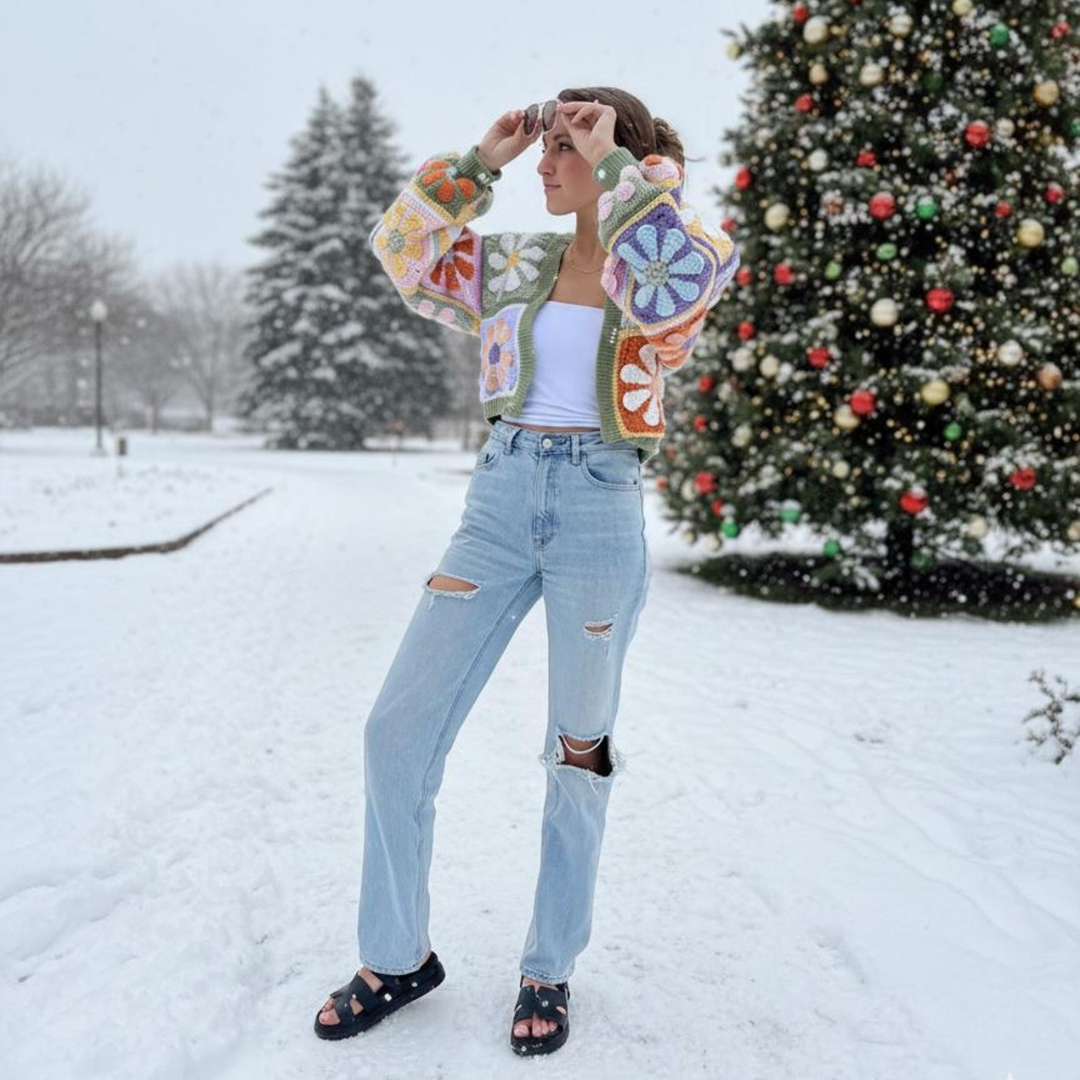 Built from bold daisy granny squares, this cardigan features a relaxed cropped shape, cozy sleeves, and clean ribbed edging that frames the design beautifully. Each square adds texture and charm, creating a garment that feels artistic, expressive, and truly one of a kind.